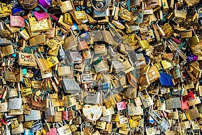 Op de Pont des Arts in Parijs hebben geliefden allemaal slotjes opgehangen met hun namen en soms met een datum.